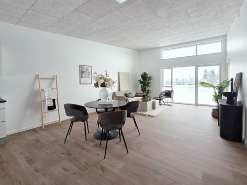 De 14 boliger stod klar til indflytning august 2025 og er arrangeret i to rækker, der omslutter et indre grønt område med stier og opholdsrum for beboerne og resten af byen. Mellem de to rækker ligger et centralt fælles renovationsområde med et større fællesskur til boligerne.